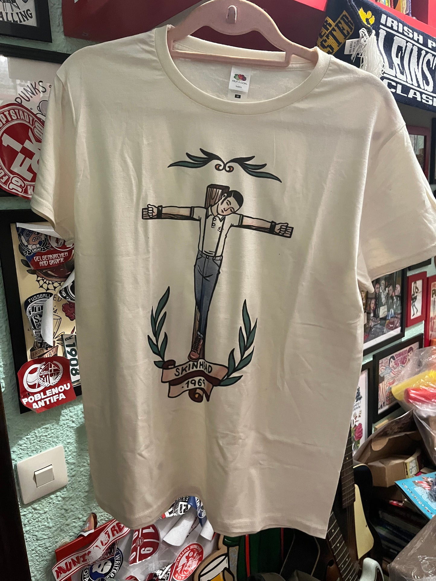 T-shirt with the skinhead crucified design on the front.